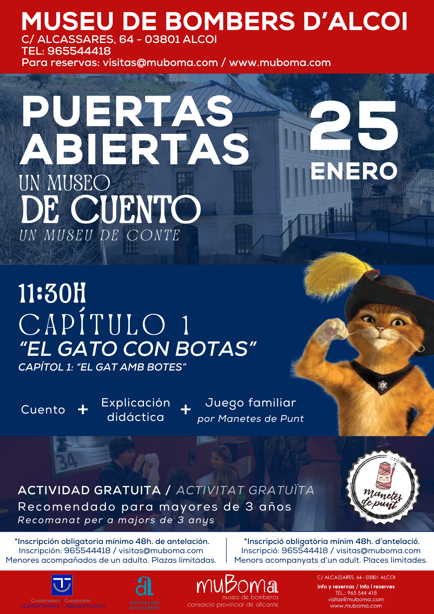 El día 25 de enero empieza la primera de las jornadas gratuitas del ciclo. A las 11:30h. tendremos “Un museo de Cuento. Capítulo 1”. Conoceremos con Manetes de Punt el cuento “El gato con botas” que nos ayudará a entender qué es un EPI y cómo son los diferentes uniformes que utilizan los bomberos y bomberas en sus intervenciones. Tras el cuento habrá una explicación didáctica y un juego para toda la familia.